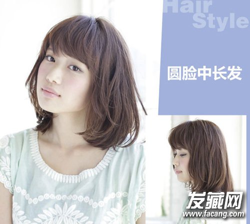 这款中长发的齐刘海烫得稍微蓬松,齐肩的头发同样烫得比较蓬松,较为随意的发型显出了圆脸MM的个性。