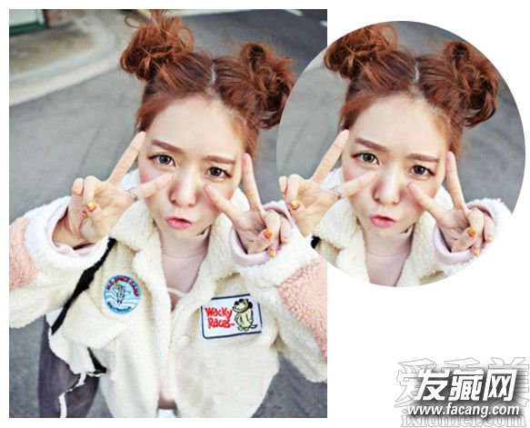 清爽的露额发型与可爱的双花苞头很适合有少女心的姑娘哦,这样看来中分勾勒出圆脸的时尚感来,黄棕色发色时尚简约。