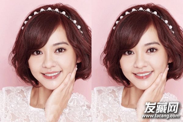 韩国淑女系短卷发发型,红棕色染发的发丝最显肤白,蓬松的内扣发尾设计搭配弧形斜刘海设计修颜瘦脸。