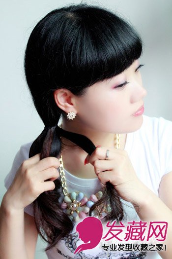 将头发分成均等的两束,在分好的两小束头发中,从右边那束头发的最右边取出一小束