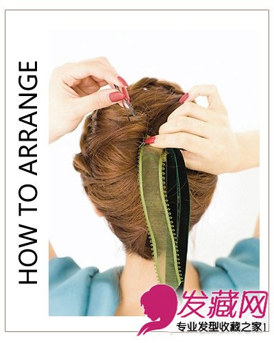 step 4:黑色发卡将丝带固定在发尾就完成这款发型。