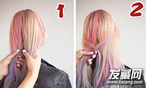 STEP1-2:将长发全部疏到脑后,先把你的头发分成两个相等的部分。再把两边的两束头发分成1、2两个等分。