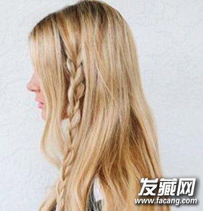 STEP2:一向编至发尾,用小皮筋固定住,然后悄悄拉扯发辫,营造出疏松天然的感受。另一侧进行相同的编发。