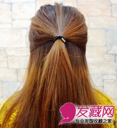 步骤一:下面就要开始我们的发型教学了哦。首先将头发分成上下两层,上面的头发扎成马尾。
