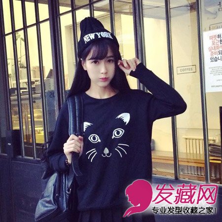 自然的黑色长直发,半月形的刘海搭配披肩发最显温柔气质,毛线帽和卫衣的搭配彰显青春活力。