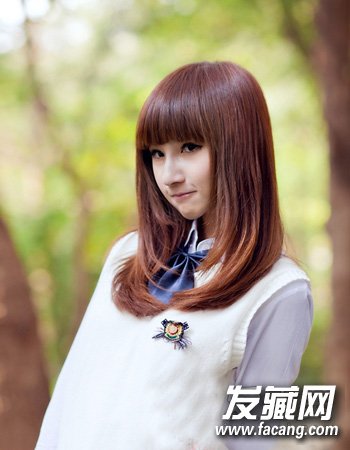 如果你是一名大学女生的话做上一款简单的染发发型也是不错的,而配合这种甜美的中长发造型设计与清新的齐刘海更是修颜还显可爱感,温暖的棕色染发同样时尚感十足。