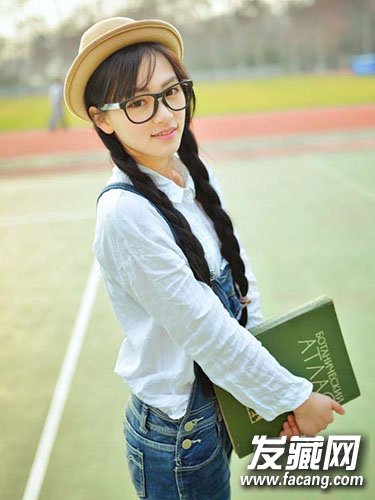 斜分刘海,长发分两边,编成麻花辫子,小巧帽子搭配黑框眼镜,尽显文艺范。