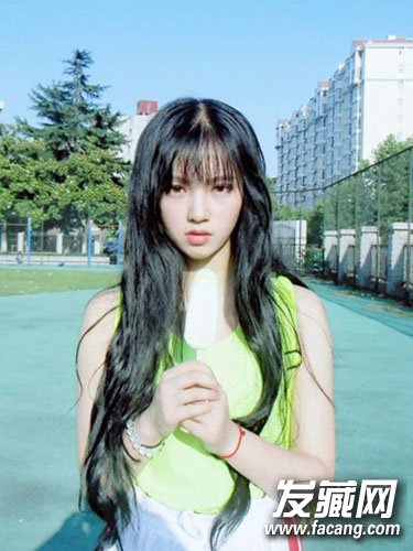 空气感齐刘海,黑色长发烫卷处理,彰显清新校园风范。
