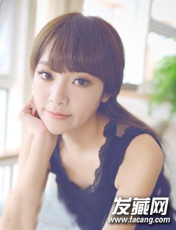 齐刘海不仅挡住了大额头还很显嫩哦,披肩长发,半扎淑女发型,柔美的平刘海微微斜分散发出甜美简约的韩式气质。