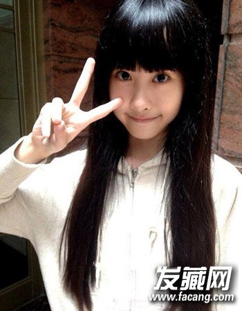 再是一款萌态十足的女生齐刘海黑长直发发型,齐刘海发型本就是一款百搭式的造型,这种乌黑的长发配合整齐的刘海造型更是彰显小女生型清新可爱的学院风。