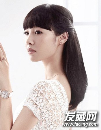 简单知性的一款公主头发型,是不少淑女喜欢的造型哦,简单的将两鬓的发丝拨出来打造出半扎发的效果,加上齐刘海的设计 显露出既知性又优雅的一面来。