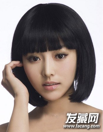 一款时尚的短发波波头发型,厚重的短发波波头加上齐刘海的设计完美的勾勒出气质感,发尾内扣包裹住下巴显露出时尚感来。柔黑的发色不仅显肤白而且造型十分有气质。