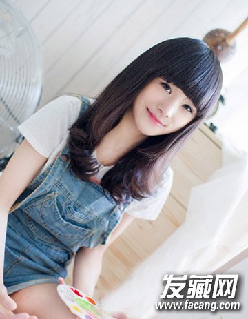 简单的中长直发发型是校园最常见的一款造型,厚生的圆弧形平刘海显露出甜美的一面来,发尾微卷搭配上背吊装颇有校园的活力与青春范。