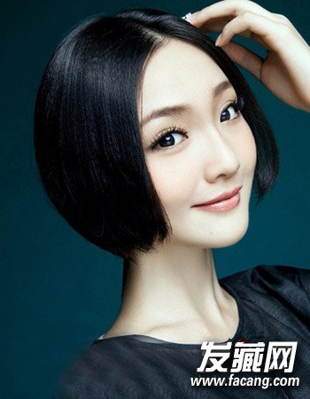 一款清新的中短发发型,柔顺的短直发贴着脸颊两侧打造出别致的优雅范来,气质的中分发型设计显露出无比的青春与时尚感,黑色头发颇有光泽。
