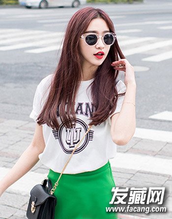 简单的长直发,搭配上酒红色的染发,打造出时尚靓丽的感觉,中分的刘海设计也轻松修颜,提升了整体的气质。