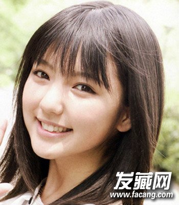 很有淑女范儿的一款日式中学生直发发型,乌黑的披肩长直发垂坠感十足,飘逸的长发配合齐刘海修饰脸蛋,甜美可爱。