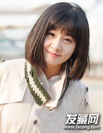 齐肩的头发长度十分清爽干练,打理出厚重的蓬松感,瞬间瘦脸,搭配及眉的齐刘海,令女生看起来十分清纯甜美,如果这时候再化上一个精致的妆容,那就更好了。