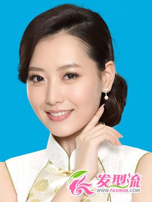 低低的盘发造型搭配具有名族风采的旗袍,高贵大方不失复古的味道!厚重服帖的斜刘海展露出她精美的五官,见得耳坠让她看上去更加的迷人!