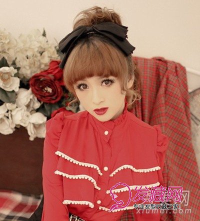 齐刘海的梨花头扎起来十分的养眼,蘑菇头的圆润刘海,带着两束的卷度,再佩戴可爱的黑色蝴蝶结打造出日系效果。
