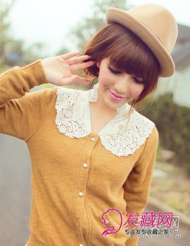 将齐刘海短发盘起来,也是精神十足,打造出森系女孩的清新风格,搭配一顶驼色的爵士帽,给人大气的优雅感。